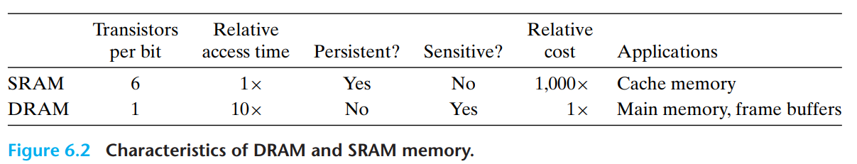SRAM is persistent as long as power is applied. Unlike DRAM, no refresh is necessary. SRAM can be accessed faster than DRAM. SRAM is not sensitive to disturbances such as light and electrical noise. The trade-off is that SRAM cells use more transistors than DRAM cells and thus have lower densities, are more expensive, and consume more power