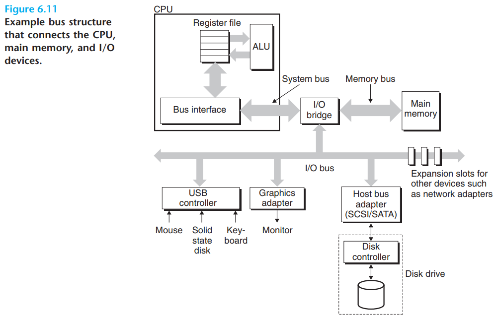 그래픽카드, 모니터, 마우스 키보드, 디스크 같은 입출력장치들은 입출력 버스로 CPU와 메인메모리에 연결된다.