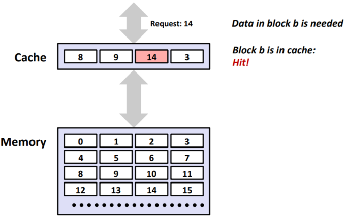 어떤 프로그램이 K+1 레벨로부터 특정 데이터 객체 d를 필요로 할때, 현재 래밸 k에 저장된 블록들 중에서 d를 먼저 찾는다. 이때 만약 d가 k에 우연히 캐시되어 있을 때 이 경우 ‘캐시 적중Cache Hit’이라고 부른다.