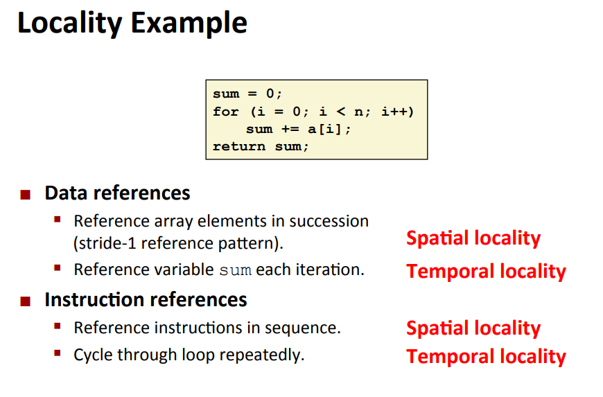 Well- written programs exhibit a property called locality: 잘 작성된 프로그램은 다른 최근에 참조했던 data item 근처의 data item이나, 최근에 자신을 참조했던 data item을 참조하려는 경향이 있다.
