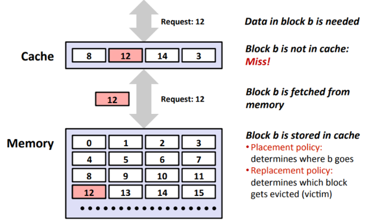 반대로 객체 d가 레벨 k에 캐시되어있지 않는다면 캐시 미스가 발생한다. 캐시 미스가 존재한다면 레벨 k에서의 cache는 k+1의 캐시로부터 d를 포함한 블록을 가져오고, k레벨의 cache가 꽉 찬 상태라면 기존 블록에 덮어 쓴다.