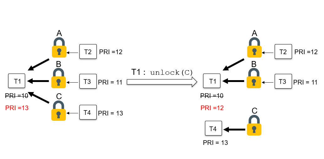 이후 Lock C가 풀리면, T1의 우선순위는 그 다음으로 높은 우선순위로 변경될 것이다.