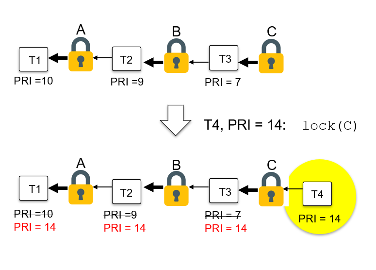 이 경우, 가장 높은 우선순위를 가진 T4의 우선순위가 중첩하여 T1의 우선순위까지 변경한다. 왜냐하면 우선순위가 높은 것이 가장 먼저 처리되어야 하는 원칙이 지켜져야 하기 때문이다. T3의 우선순위가 7에서 14로 변경되면, T3이 기다리고 있는 T2의 우선순위도 변경되고, T2의 우선순위가 변경되면 T1의 우선순위까지 변경되어야, T1의 작업이 14의 순위로 끝났을 때 T4를 실행할 수 있게 된다.