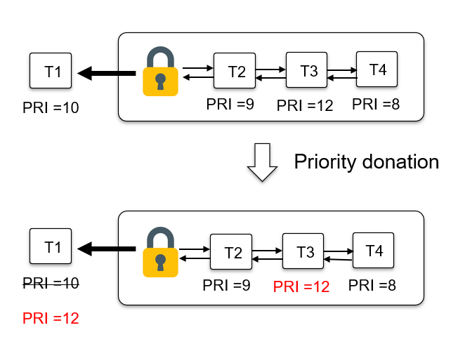 어떻게 해결할까? 높은 우선순위를 가진 스레드가 낮은 우선순위를 갖고 있는 스레드에게 priority를 기부한다. 그리고 기부받은 우선순위를 갖게 된 L이 순리대로(반전 없이) CPU를 점령하고 일을 전부 마쳤을 때 기부받은 우선순위와 CPU 할당권을 높은 우선순위를 가진 스레드에게 되돌려주는 원리이다.