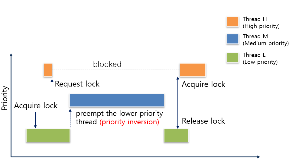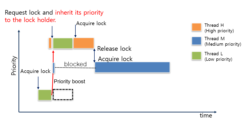 이때 H보다 우선순위가 낮은 M은 H가 종료된 뒤에야 lock을 얻는다.
