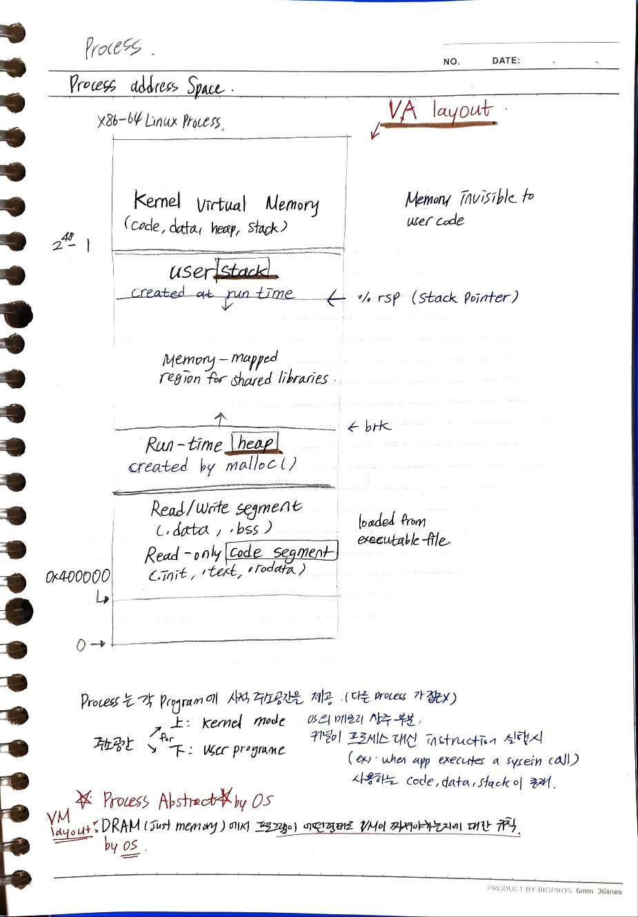프로세스는 개별적으로 주소 공간을 가진다. user stack, memory-mapped, run-time heap, sement...