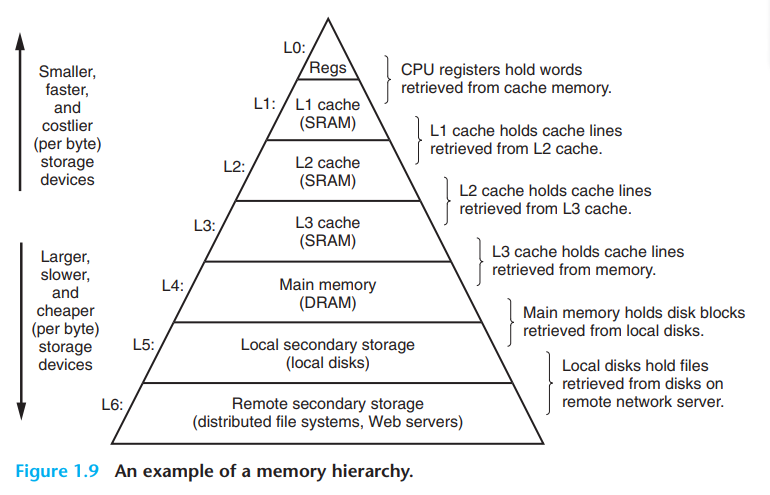 메모리 계층구조에서 아래로 내려갈수록 더 많은 정보를 저장할 수 있으나 속도는 느려진다.