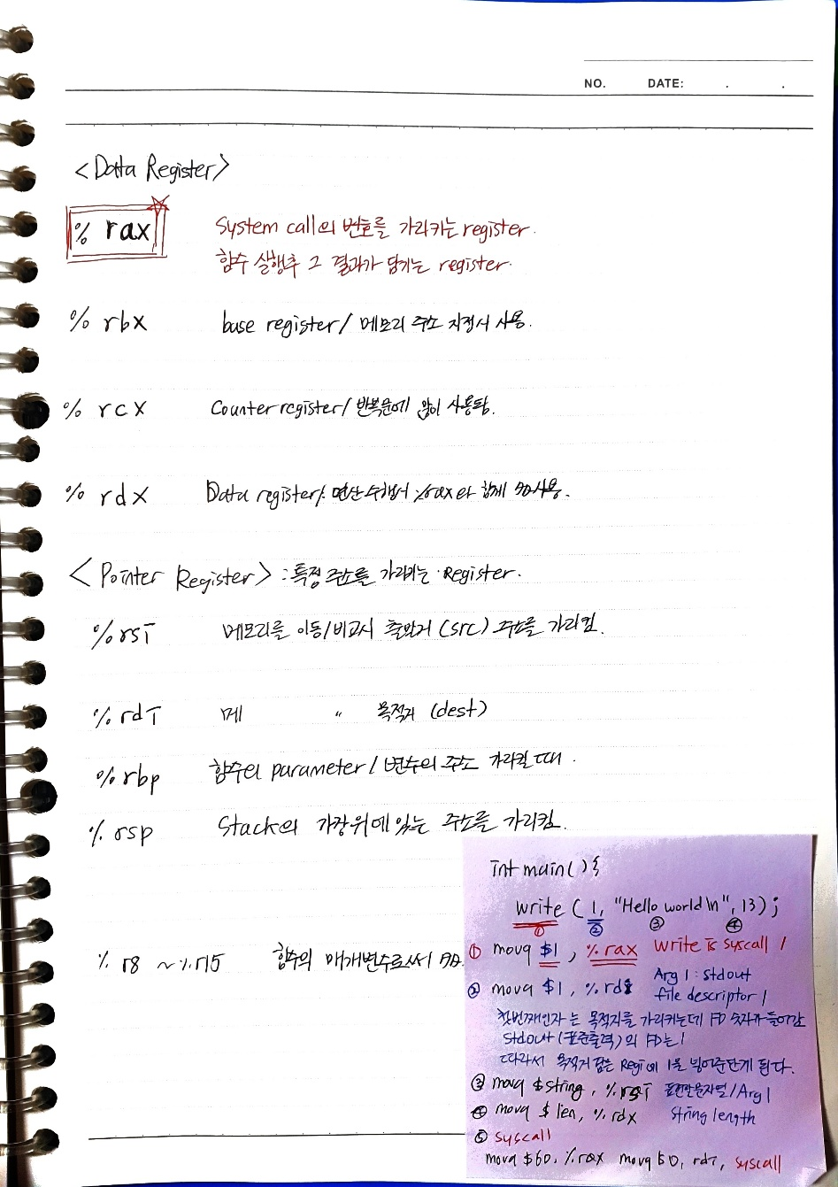 - 시스템 콜은 %rax에 각 시스템 콜 number가 저장되고, 개별 함수에 필요한 인자들은 %rdi, %rsi, %rdx ...순으로 이어지는 레지스터들에 담겨 전달 된다.
