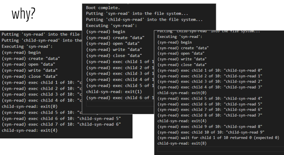 이 문제에 대한 실마리가 보였다. 저번 주 발표에서 어떤 동료가 thread 구조체의 크기에 대한 발표를 하는데 그 동료가 겪은 문제와 상황이 비슷했다. fdt(file descriptor table)을 구조체 안에 직접 넣어서, 그 크기로 영향을 받아 thread magic이 변경되어서 is_thread(t)를 통과하지 못한다는 이야기였는데, 자꾸 문제가 생기는 내 코드를 보니 thread 구조체 안에 fdt[64]로 직접 이 안에 넣고 있었다. syn 시리즈의 테스트케이스들은 동기화 테스트를 위해 동시에 여러 child를 생성하고 그 안의 파일을 read/write를 하는데 fdt table이 구조체 안에 있으면 그 크기가 계속해서 커지지 않을까? 그래서 fdt를 포인터로 바꾸니 오류가 다소 줄어들었다. 그런데도 가끔 터지는 걸 보니, 코드 내 메모리 관리에서 미세한 실수가 있는 것 같다...