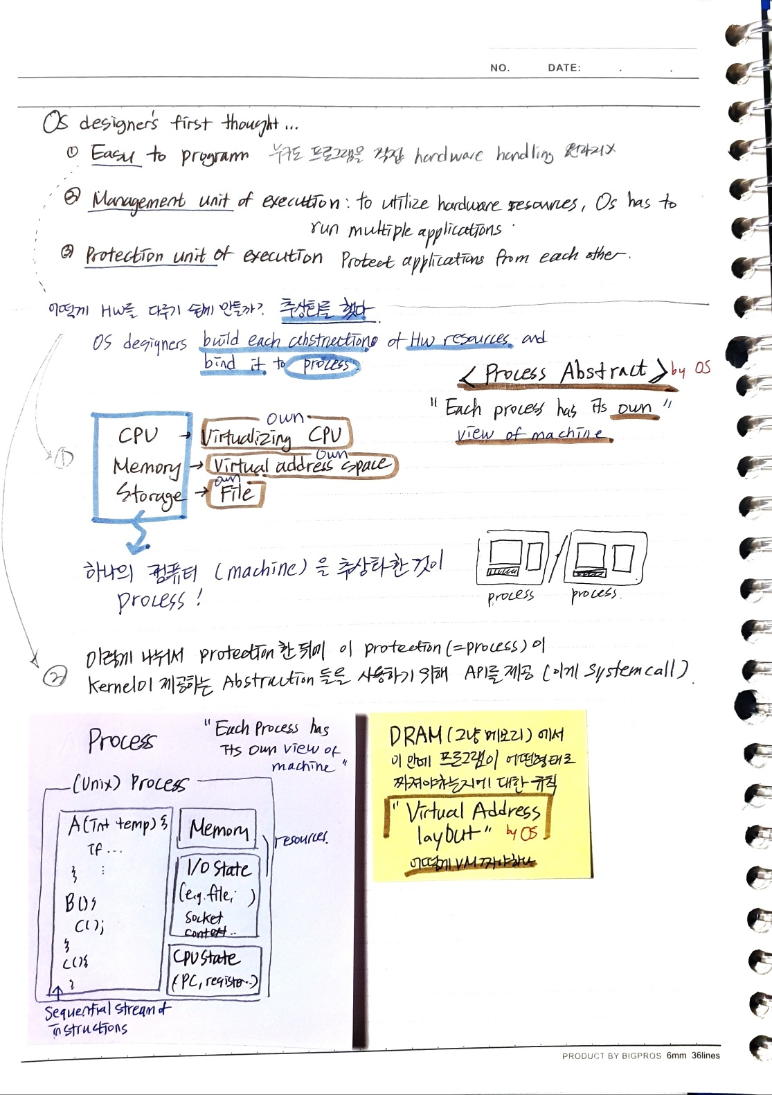 - 프로그램을 돌리기 위해 필요한 하드웨어 자원(CPU / Memory / Storage) 를 각각 가상 CPU / 가상 주소 공간 / 파일로 제각각 추상화하고, 이것을 process 로 묶었다. 가상cpu, 가상 주소공간, 파일은 단일 application이 마치 하나의 machine 위에서 실행되는 것 같은 환상을 줄 수 있게 되었다.