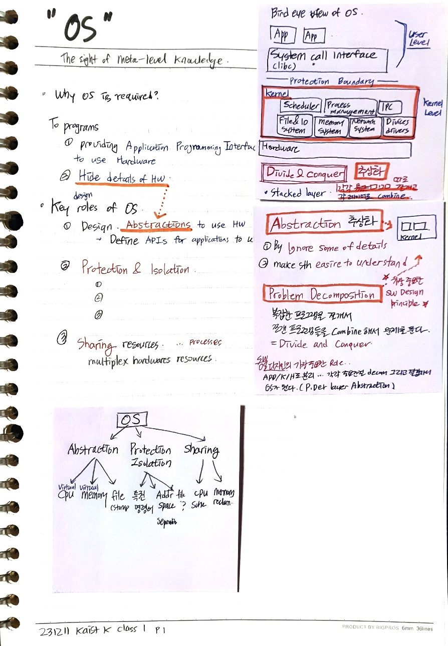 - 이렇게 추상화한 것들을 응용프로그램(application)이 쓸 수 있도록 API를 제공하고, system call 이라고 부르기로 약속했다. 이렇게 함으로써 (1) application을 제작하는 개발자들은 프로그램을 쉽게 개발할 수 있게 되었고 (2) OS는 동시에 여러 application을 돌릴 수 있게 되었으며, (3) application들은 각각 실행시 분리되어 보호할 수 있게 되었다.