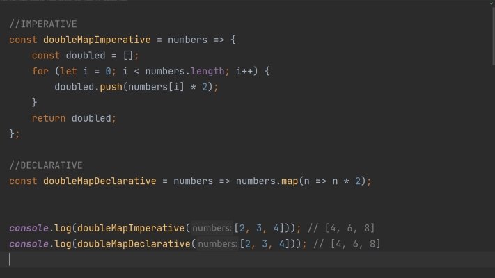 명령형 프로그래밍(Imperative Programming)은 프로그램이 어떻게 실행될지 기술하는 스타일입니다. 풀어쓰는 스타일이라고 볼 수 있습니다. 반대로 선언형 스타일 프로그래밍(Declarative Programming)은 프로그램이 무엇을 실행할지 기술하는 스타일입니다. 컴팩트하게 쓰는 스타일로 볼 수 있습니다.