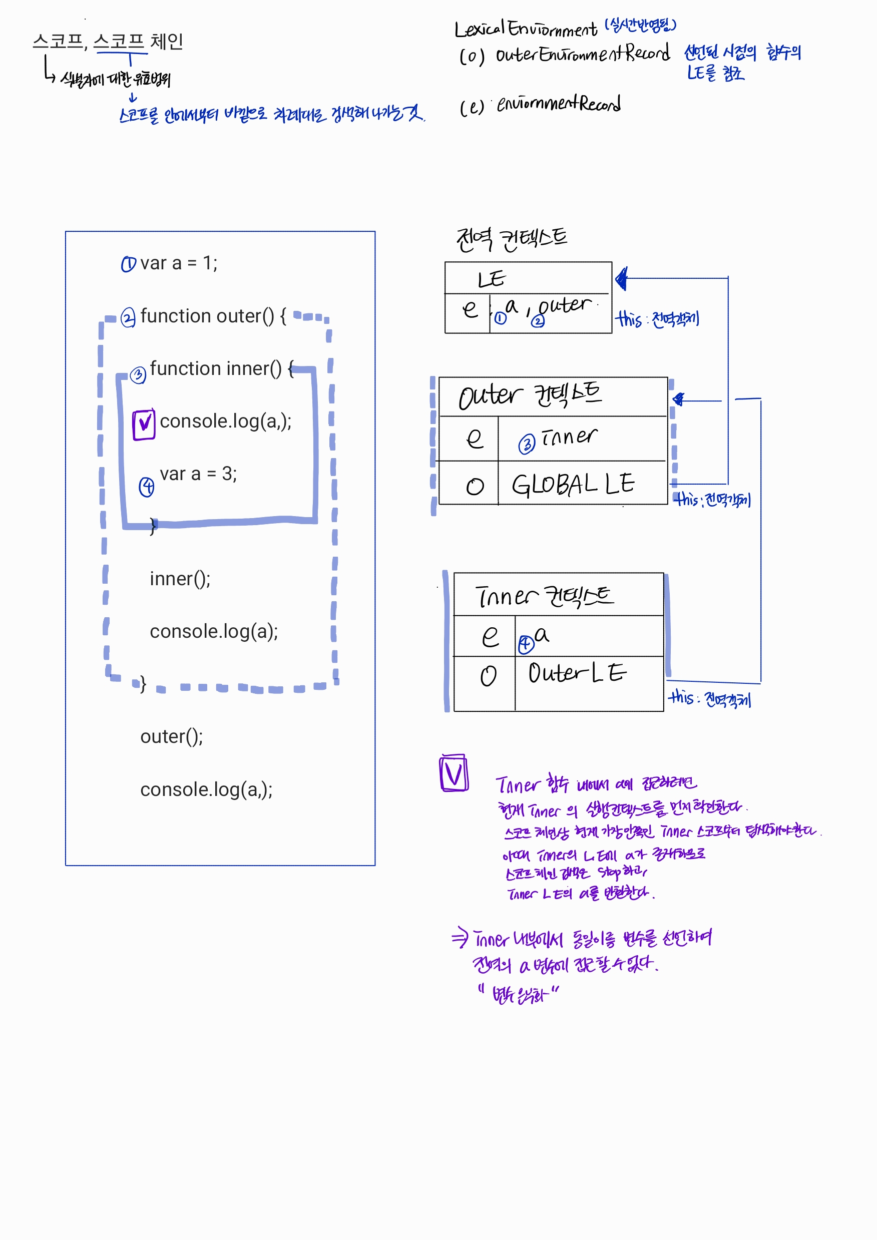 스코프는 변수의 유효 범위를 뜻합니다. 실행 컨텍스트를 생성할 때 저장되는 해당 함수의 정보(지역변수 등)가 담긴 객체(LexicalEnvironment)와 함수를 호출한 상위 함수(caller)의 객체(LexicalEnvironment) 를 참조하는 객체(outerEnvironmentReference)를 통해 탐색합니다.(이 객체는 마치 연결리스트처럼 작동합니다.) 코드 상에서 어떤 변수에 접근하려고 하면 현재 실행 컨텍스트의 스코프 정보를 탐색하여 그 값을 반환합니다. 만약 찾지 못한다면 상위 함수(caller)의 정보를 참조 중인 객체를 통해 상위 함수(바깥)으로 탐색하는 과정을 거칩니다. 전역 컨텍스트까지 탐색해도 찾지 못한다면 undefined을 반환합니다.