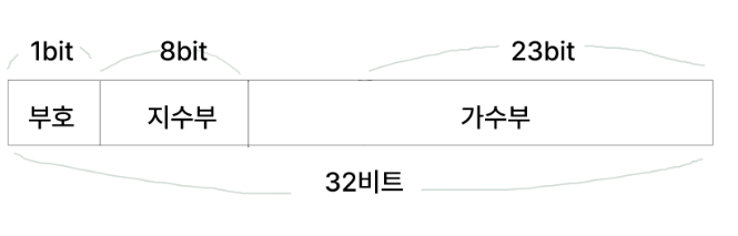 부동 소수점(floating point)은 실수를 가수부와 지수부로 나누어 표현합니다. 표현할 수 있는 수의 범위는 넓으나 정밀도가 낮을 수 있습니다. 실수를 이진법으로 변환하는 과정에서 무한 소수가 발생할 수 있기 때문이며 오차가 날 가능성이 큽니다. 따라서 넓은 범위의 수를 처리할 때 주로 사용됩니다.(게임, 대규모 계산 등)
