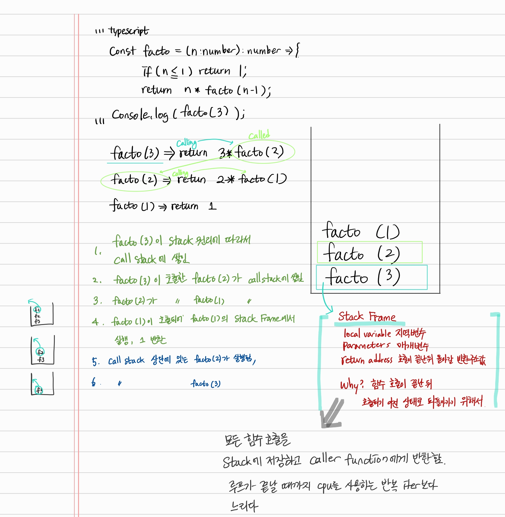 지역변수와 매개변수는 새로 자기 자신을 호출할 때마다 전달되고 함수의 상태는 stack memory에 저장된다. 따라서 모든 재귀는 stack에 일정한 메모리를 소모하고, 만약 재귀가 stack에 할당된 메모리를 소모할 만큼 많이 불린다면 stack overflow error가 발생한다.