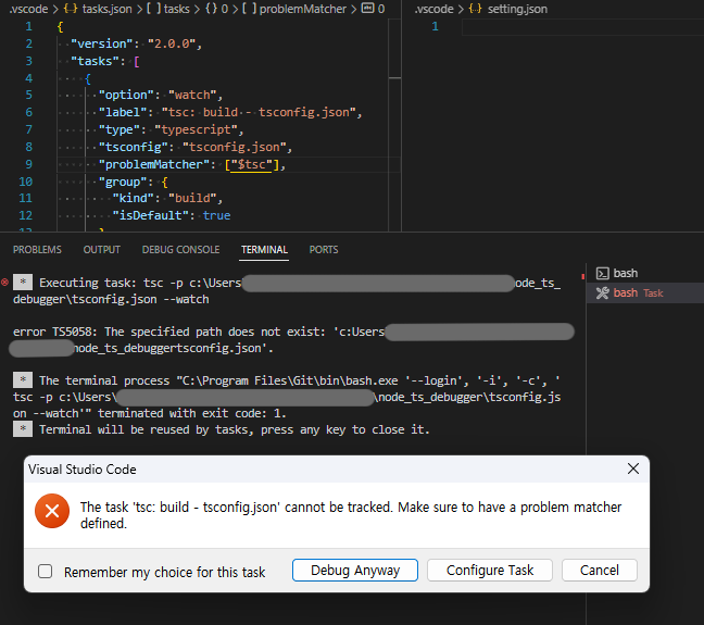 아래 터미널 로그를 보면 여전히 문제가 생긴 것 같은데, [틀린 가정]problemMatcher에서 말그대로 빌드 중 생기는 문제를 해결하는 다른 코드로 연결해 주어 경고창이 뜨지 않는 것 같다... 고 가정했다. problemMatcher가 무엇인지 알아야 왜 실행이 되는 건지, 이것이 해결 방법이 맞는지 알 수 있을 것 같다.