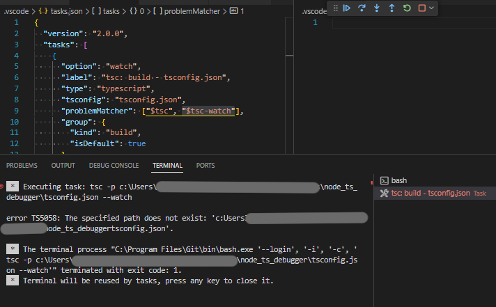 이것저것 시도해보다가 이 이슈에 달린 코멘트에서 힌트를 얻었다. 기존에 설정할 때, 내가 tsc watch로 실행한 것 같은데...(이것저것 시도하다가 정확히 기억이 나지 않았다) 그렇다면 tasks.json를 추가하고, 그것의 option을 주면 되지 않을까?