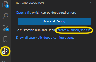 Run and Debug 클릭 / Ctrl+Shift+D 를 눌러 진입, launch.json 생성 링크를 클릭.