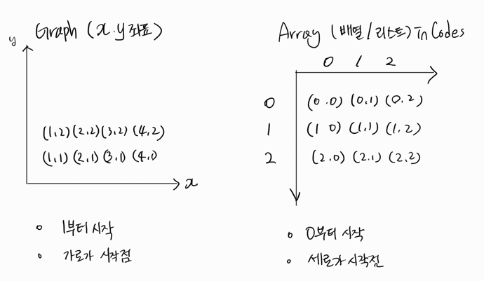 BFS, DFS 문제를 풀 때 변수명을 x, y로 적고, 주어진 입력값에서부터 가로/세로를 따로 변수에 넣어주는 문제를 풀다가 놓쳐서 필요 없는 삽질을 했다. x, y 방식은 가로축인 x가 선행하는데, 실제 코드상으론 2차원 리스트의 세로, 즉 y축이 선행하기 때문이다. 알고리즘 테스트를 준비할 때에는 후자로 통일해서 이렇게 생각하기로 했다: arr[y][x]