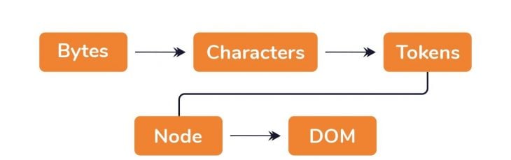 Raw bytes -> characters -> Tokens -> Node -> Dom