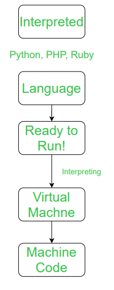 인터프리터 언어는 런타임 환경에서(프로그램이 실행되는 동안) 한 줄 한 줄 실행하고 각 명령을 실행합니다. (컴파일 언어와 다르게)명령어가 다른 프로그램(가상 머신)에서 실행되고, 별도의 실행 파일이 존재하지 않습니다. 컴파일 언어보다 더 느렸지만, just-in-time 컴파일 이후로 그 격차가 줄어들고 있습니다.